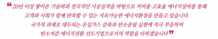 대신에스앤비는 20년 이상 쌓아온 기술력과 전국적 시공실적을 바탕으로 저비용·고효율 에너지설비를 통해 고객과 사회가 함께 만족할 수 있는 지속가능한 에너지환경을 만들고 있다.