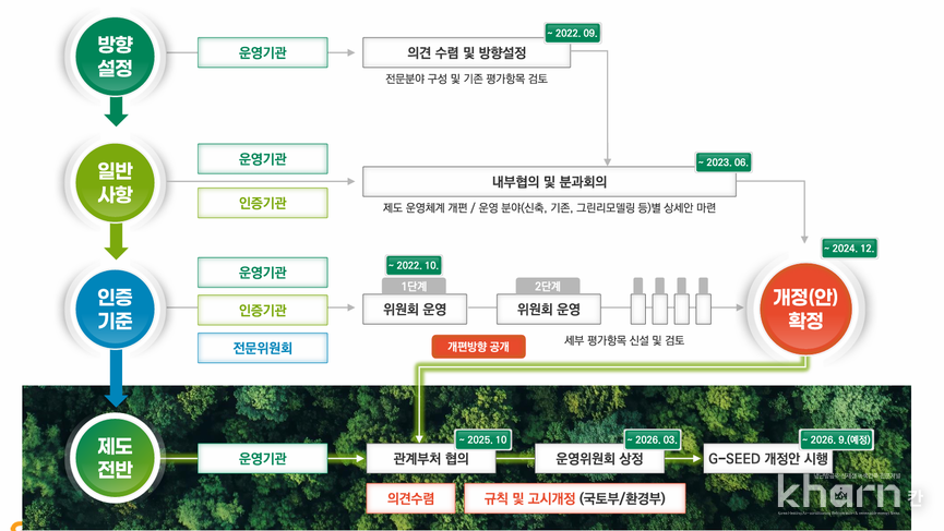 지난 2016년에 틀을 잡은 현행 인증제도는 △기후변화대응 부족 △평가항목의 실효성 및 현장적용성 부족 △국제인증과의 정합성 및 위상저하 등에 대한 아쉬움이 있었었다.