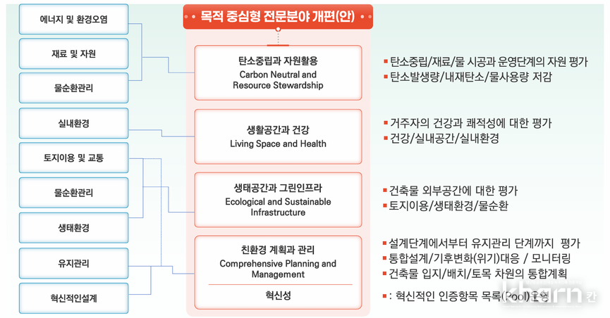 건설연은 기존 단순히 녹색건축물이라고 하는 하나의 목적이 아닌 다양한 방향으로 접근가능하도록 △탄소중립과 자원활용 △생활공간과 건강 △생태공간과 그린인프라 △친환경 계획과 관리 항목 등 4개부문으로 개편을 진행했다. 이를 통해 건물기획부터 폐기단계를 아우르며 시공단계의 자원관리와 운영단계의 에너지성능에 대한 포괄적 검토가 이뤄질 수 있을 것으로 기대된다. 또한 평가기준 고도화 및 현행화, 유사목적을 가진 항목 통합, 항목삭제 13개, 신규 8개 신설이 이뤄졌다.