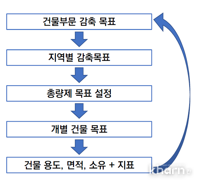 총량제는 국가온실가스감축목표(NDC)에 맞춰 건물부문 온실가스를 줄이기 위한 체계를 마련해 장기적인 로드맵을 추진하고 있다. 지역단위와 개별건물 단위총량제를 연계하기 위해 △개별건축물총량 △지역별목표량 △국가목표량 등 환류체계 검토 후 각 단계별 지표를 설정해야 한다.