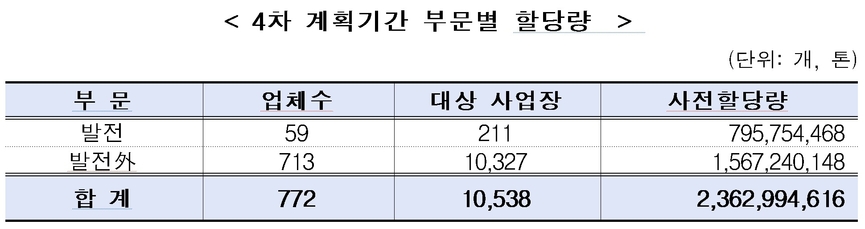 4차 계획기간은 ‘제4차 배출권거래제 기본계획(2024년 12월)’에서 정한대로 발전 및 발전 외 2개 부문으로 운영된다. 발전부문은 전력을 생산, 판매하는 사업장을 대상으로 하며 59개 기업에게 7억9,575만톤이 할당됐다.