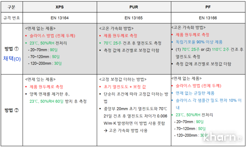 현재 유기단열재 장기열전도율 평가는 KS M ISO 11561의 슬라이싱 가속화 시험법으로 진행되고 있다. 해당 시험방법은 독립기포 파괴방지와 성형 특성상 기밀표피재를 사용하는 PF·PUR단열재는 적용범위 한계를 가지고 있다.