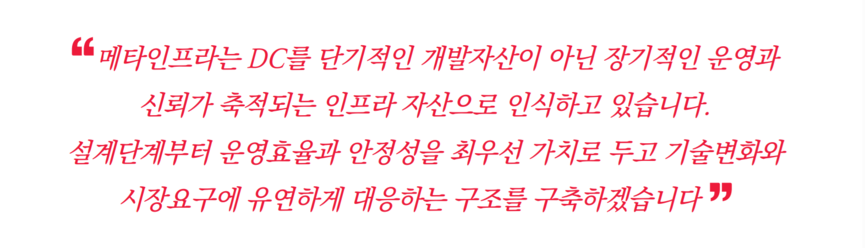 또한 메타인프라는 데이터센터를 단순 임대자산이 아닌 장기운영 중심의 플랫폼 사업으로 확장할 방침이다. 설계·건설단계에서부터 운영효율과 유지관리 편의성을 고려한 구조를 적용하고 운영단계에서 에너지관리·설비최적화·안정성 중심 등의 서비스를 강화해 고객과 장기파트너십을 구축하고자 한다.