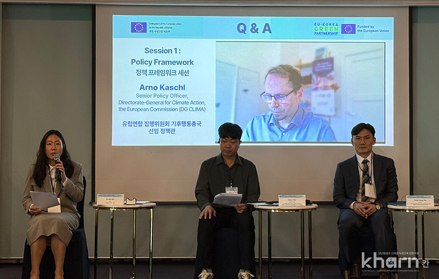 정책세션 질의응답 시간에는 노진선 기후솔루션 팀장을 좌장으로 Arno Kaschl 선임정책관, 한상우 기후부 사무관, 김영성 한국환경공단 과장 등이 참여했다.
