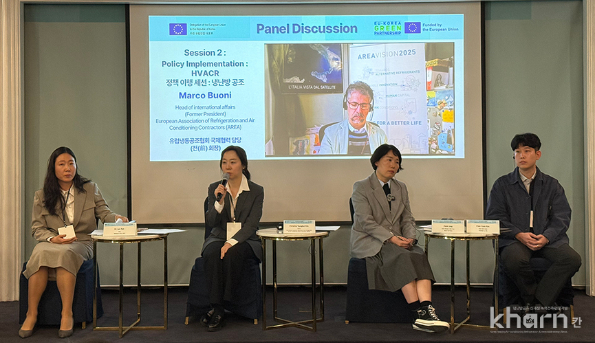 세션2: 정책 이행현황 및 전체토론은 △EU정책 및 기술/교육/자격인증 현황(Marco Buoni 유럽냉동공조협회(AREA) 국제협력 담당(前 회장)) △한국정책 이행현황(김영희 한국냉동공조산업협회(KRAIA) 대외협력 이사) △냉난방공조분야 정책이행 관련 전문가토론(좌장: 노진선 기후솔루션 Methane&HFCs 팀장) 등을 주제로 진행됐다.