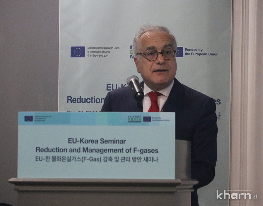 우고 아스투토 주한 유럽연합(EU) 대사는 개회사를 통해 “에어컨, 히트펌프, 단열재 등 산업공정에 널리 사용되는 F-gas는 소량으로도 강력한 온난화효과를 유발하며 기상패턴 교란, 해수면상승, 생태계파괴의 원인이 된다”라며 “EU는 2024년 새로운 F-gas 규정을 채택해 2050년까지 HFCs를 단계적으로 폐지하고 산업혁신을 통해 새로운 기회를 창출하고자 한다”고 밝혔다.