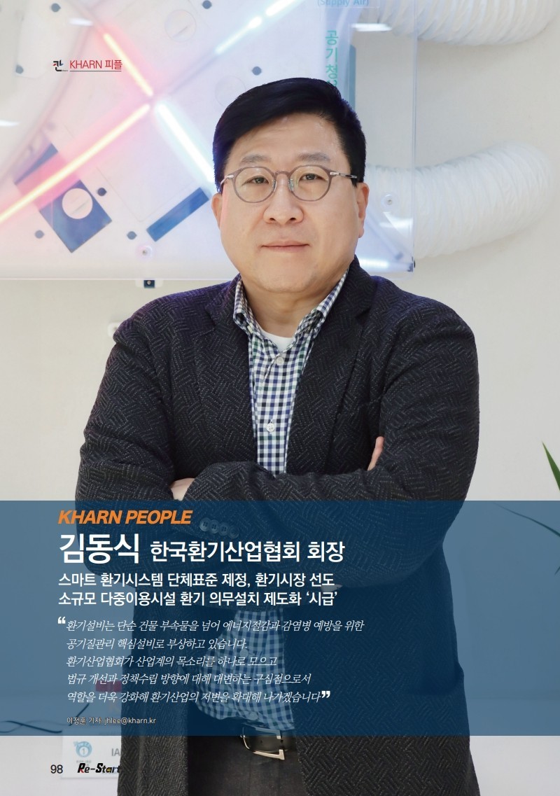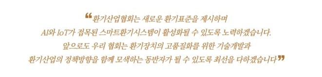 이어 환기산업협회는 ‘환기표준’을 만드는 곳이라는 점이다. 기존 환기장치가 단순히 공기를 교체하는 수준이었다면 협회는 AI(인공지능)와 IoT(사물인터넷)기술이 접목된 스마트환기시스템의 단체표준을 제정하고 있다. 그만큼 회원사들은 트렌드를 가장 먼저 파악하고 더욱 많은 기회를 얻을 수 있다.