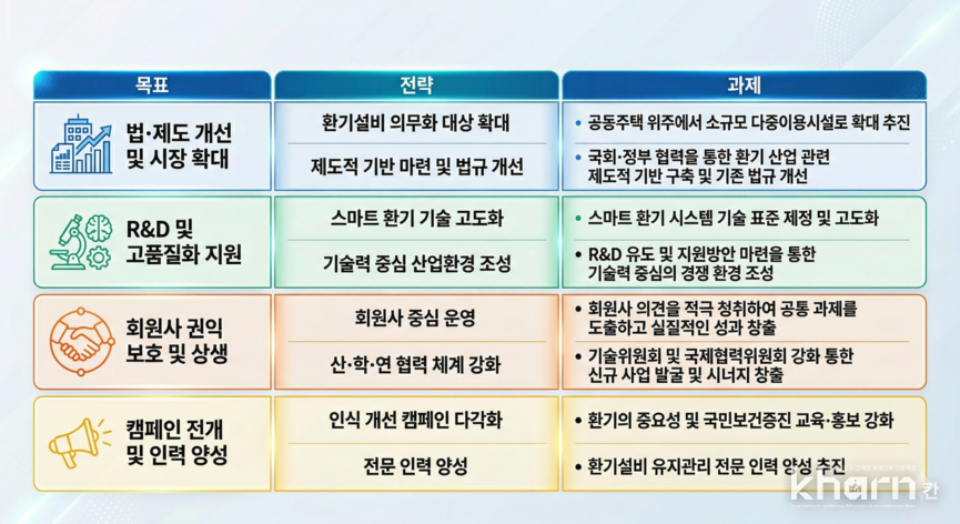 환기시장 확대를 위해 법률·정책 개선과 홍보활동도 적극 추진할 예정이다. 국회 및 정부기관과 협력을 강화해 환기산업에 필요한 제도적 기반을 마련하고 대외 홍보를 통해 환기산업의 중요성과 필요성을 널리 알리는 것이 무엇보다 중요할 것으로 보인다.