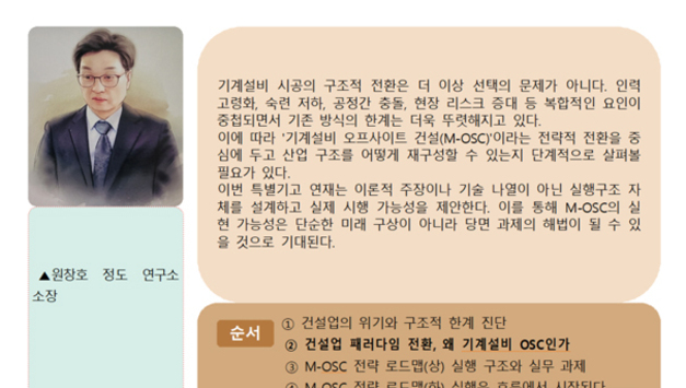 OSC(Off-site Construction)는 그동안 건축분야를 중심으로 골조, 외장, 인테리어 등 비교적 표준화가 쉬운 영역에서 주로 발전해 왔다. 그러나 MEP(Mechanical, Electrical, Plumbing)분야, 특히 기계설비의 경우 특유의 복잡성과 정밀성으로 인해 OSC 적용이 지체돼 온 것이 사실이다. 기계설비는 냉난방, 급배수, 환기 및 전력공급과 같은 건축물의 핵심 인프라시설로, 현장 맞춤형 시공과 복잡한 설계과정이 필수적인 반면에 건축입장에서는 접목이 쉽지 않고 MEP분야는 건축에 따라오는 인식 등이 관성적으로 흘러 온 이유이기도 하다. 기계설비 OSC가 일반화되지 못한 가장 큰 이유는 공장에서 사전 제작된 모듈이 현장여건과 정확히 일치하기 어렵다는 점 때문이다. 그러나 이는 역설적으로 건설산업의 혁신과 발전 가능성이 가장 큰 영역이 바로 기계설비라는 점을 시사한다. 이 공백을 선제적으로 메워 나갈 수 있는 체계적인 기계설비 OSC(M-OSC) 구축이야말로 향후 건설산업 전반의 구조적 문제를 해결할 수 있는 핵심전략이 될 수 있다. 다행인 것이 하이테크건설분야에서 각 대형 건설사별로 모듈화 노력은 이뤄지고 있으나 일반화되고 있지