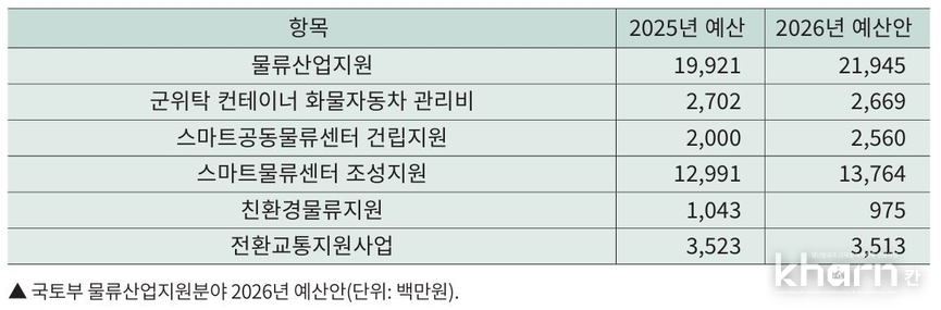 관련 예산은 물류산업지원사업으로 219억4,500만원이 책정됐다. 지난해 199억2,100만원보다 증가한 수치다. 물류산업지원사업은 △군위탁컨테이너 화물자동차 관리비(26억6,900만원) △스마트공동물류센터 건립지원(35억6,000억원) △스마트물류센터 조성지원(137억6,400억원) △친환경물류지원(10억4,300억원) △전환교통지원사업(35억2,300억원) 등으로 구성됐다.