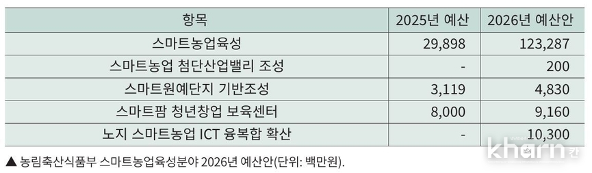 2026년 농림축산식품부 예산안이 사상 첫 20조원을 넘어섰다. 농식품부는 2026년 예산안을 올해보다 6.9%(1조2,934억원) 증가한 20조350억원 규모로 편성했다고 밝혔다. 특히 AI기반 농업의 스마트화, K-푸드 수출확대 등 농식품산업 성장 등도 적극 뒷받침할 계획으로 스마트농업육성 관련 예산은 전년 298억원보다 4배 이상 증폭된 1,232억원으로 편성됐다.