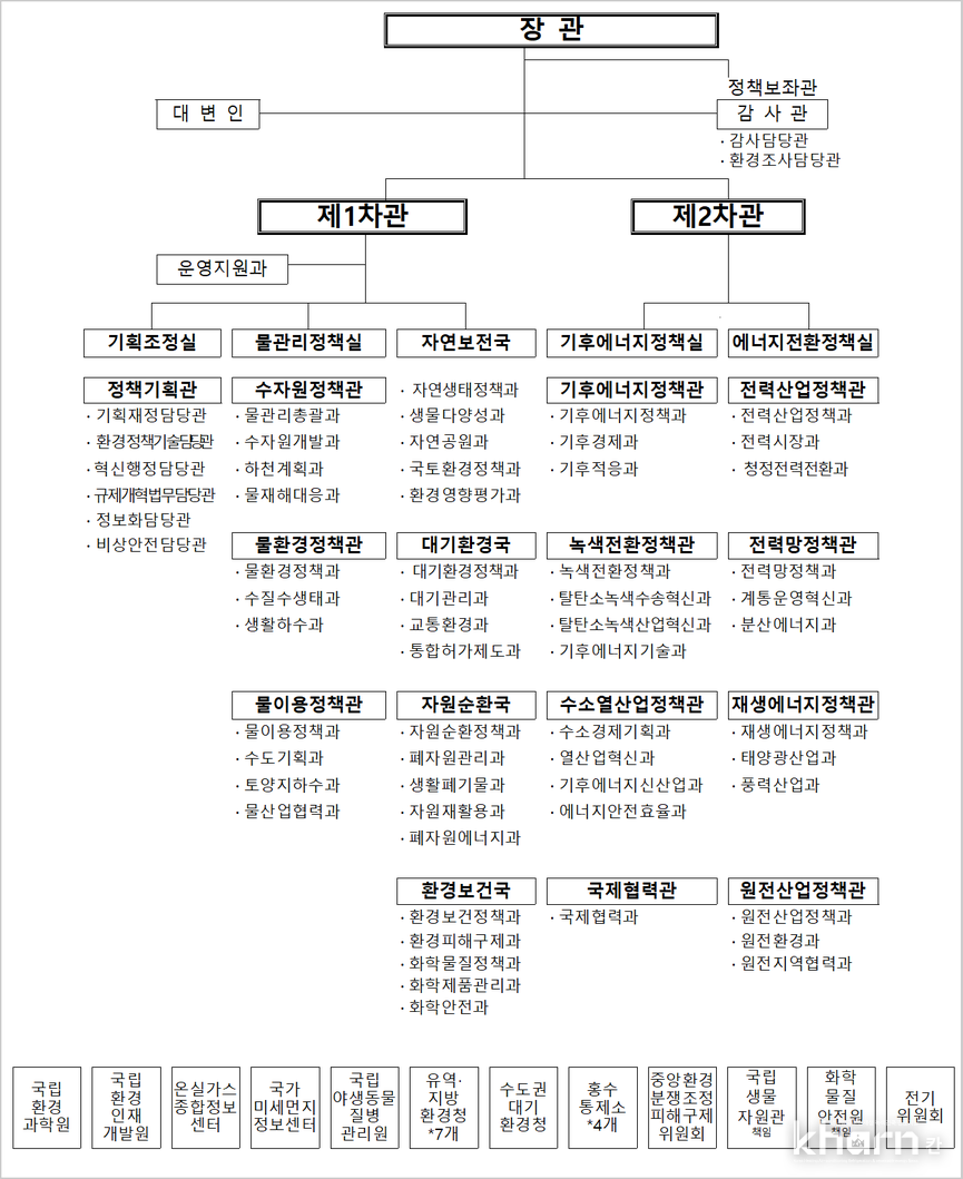 1차관 소속으로 기획조정실, 물관리정책실과 자연보전국, 대기환경국, 자원순환국, 환경보건국을 편제해 △하천 자연성 및 생태계 회복 △미세먼지 저감 △순환경제 구축 △화학물질 안전 등 새정부 국정과제에 포함된 핵심 환경정책의 차질 없는 추진과 국민 체감형 환경 서비스를 확대한다.