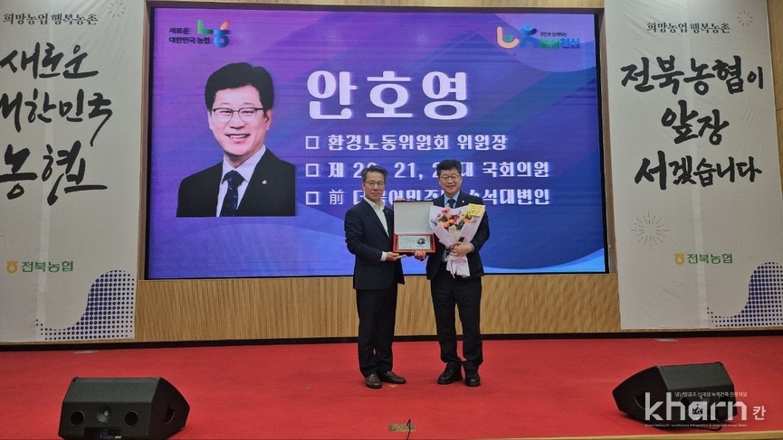 안호영 국회 기후에너지환경노동위원장(전북 완주·진안·무주)은 10월2일 농협중앙회로부터 감사패를 수상했다고 밝혔다. 이날 감사패 전달식에는 박서홍 농협경제지주 대표, 이정환 농협중앙회 전북본부 본부장을 비롯한 농축협 조합장 25명이 참석해 축하의 인사를 전했다.