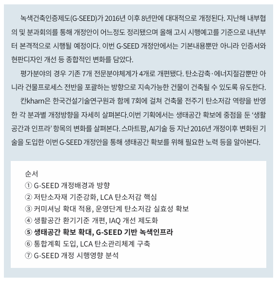 건설연은 G-SEED 개정을 통해 건물과 건물외부공간까지 고려하는 유일한 분야인 ‘생태환경과 그린인프라 항목’을 개편하기 위해 건물을 둘러싼 근린생활단위로까지 해당영역 확장을 도모하고 있다.