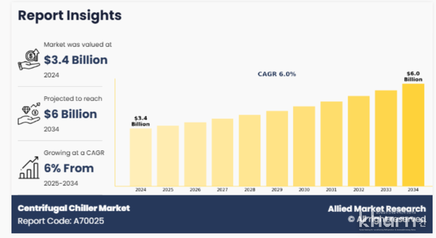 보고서에 따르면 지난해 34억달러로 평가된 글로벌 원심식냉동기시장 규모가 2034년까지 60억달러에 이르며 2025년부터 2034년까지 연평균 6% 성장할 것으로 분석됐다.