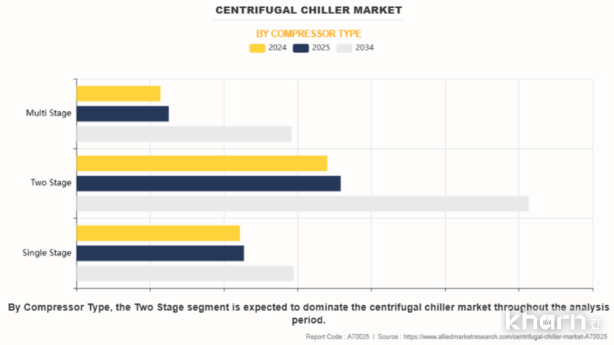 원심식냉동기시장은 압축기 유형에 따라 △단일압축 △2단압축 △다단압축 등으로 구분된다. 2단압축기는 △산업용냉각 △대규모공정환경 등에서 높은 신뢰성을 기반으로 시장확대를 주도하고 있다.