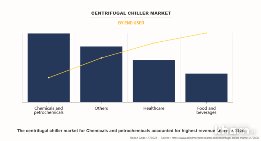최종사용자 기준으로 원심식냉동기시장은 △화학·석유화학 △식음료 △의료 △기타 등 부문으로 구분된다. 이중 화학·석유화학분야는 극한환경에서도 작동할 수 있는 고내구성시스템이 요구돼 산업공정 전반에서 높은 수요를 유지하며 가장 큰 시장점유율을 차지하고 있다.