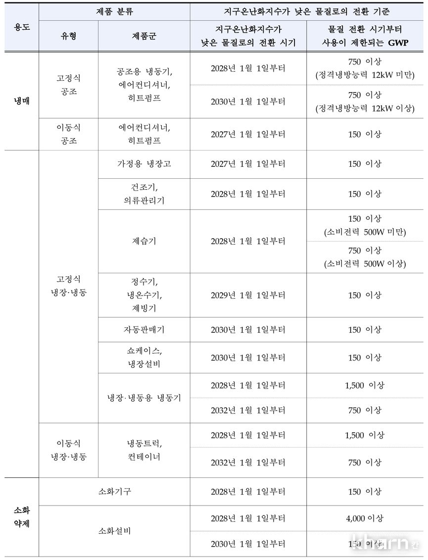 냉동기와 냉동트럭, 컨테이너 등 물류·산업용 냉동설비는 두 단계에 걸쳐 기준이 강화된다. 2028년부터는 GWP 1,500 이상 냉매사용이 제한되며 2032년부터는 기준이 750으로 더욱 강화된다. 저온·대용량 냉동설비의 기술적 특성과 대체냉매 상용화 속도를 반영한 것으로 냉동물류산업이 점진적으로 친환경냉매체계로 전환하도록 유도하는 것으로 보인다.