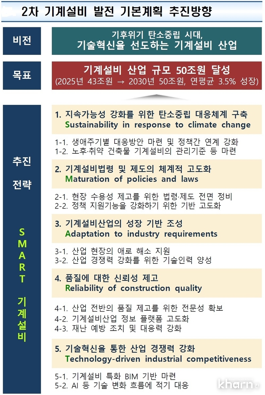 이에 따라 제1차 기계설비발전 기본계획(2021~2025)이 2025년에 만료됨에 따라 최근의 산업 및 정책여건 변화를 반영한 새로운 중장기 전략이 필요했으며 그간의 추진과제를 점검·보완하고 중장기 발전방향에 따른 신규 과제를 반영한 ‘제2차 기계설비발전 기본계획’(2026~2030) 수립이 추진됐다.