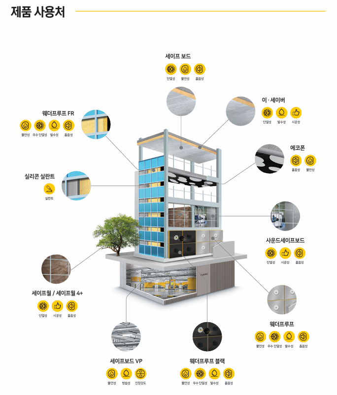 카탈로그에는 △웨더프루프 △세이프보드 △이·세이버, 에코폰 등 주요 제품별로 적용 가능한 친환경인증 항목이 정리돼 있으며 실제 G-SEED와 LEED인증을 획득한 △데이터센터 △업무시설 △주거시설 △공공시설 등의 적용사례도 함께 수록됐다. 이를 통해 설계단계부터 친환경인증전략 수립과 자재선택에 실질적인 참고자료로 활용할 수 있도록 했다.