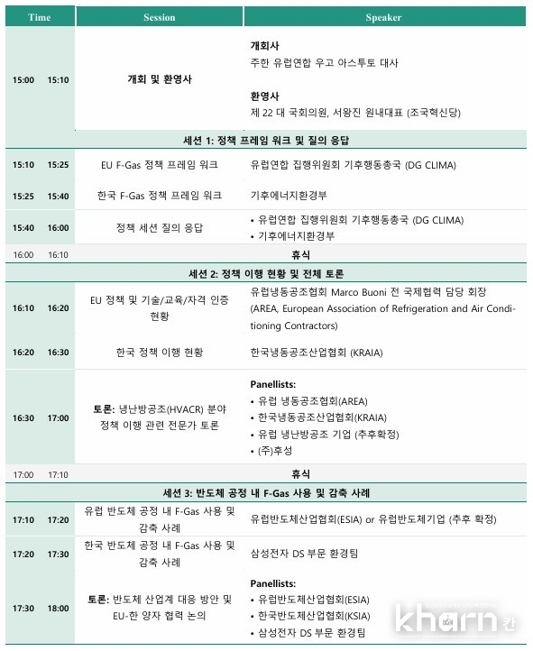 행사는 우고 아스투토 주한 유럽연합 대사의 개회사와 서왕진 조국혁신당 원내대표(제22대 국회의원)의 환영사로 문을 연다. 첫 번째 세션에서는 EU 집행위원회 기후행동총국(DG CLIMA)과 기후에너지환경부가 각각 EU와 한국의 F-Gas 정책 프레임워크를 발표하며 양측이 함께하는 질의응답을 통해 정책 간 비교와 협력 방향을 직접 논의한다.