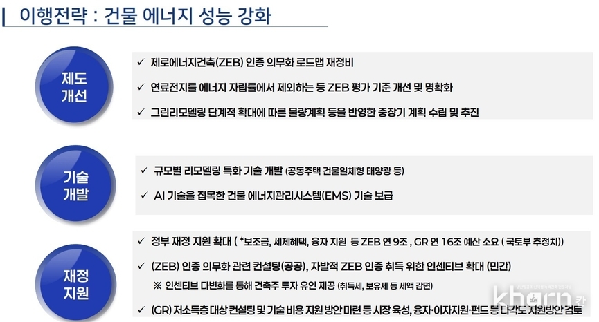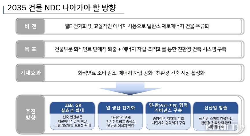 2035 NDC 이행을 위해서는 △열에너지 전기화 △건물에너지성능 강화를 위한 ZEB 주류화 △건물배출량 관리와 에너지효율 개선 강화 등이 핵심 추진전략이다.