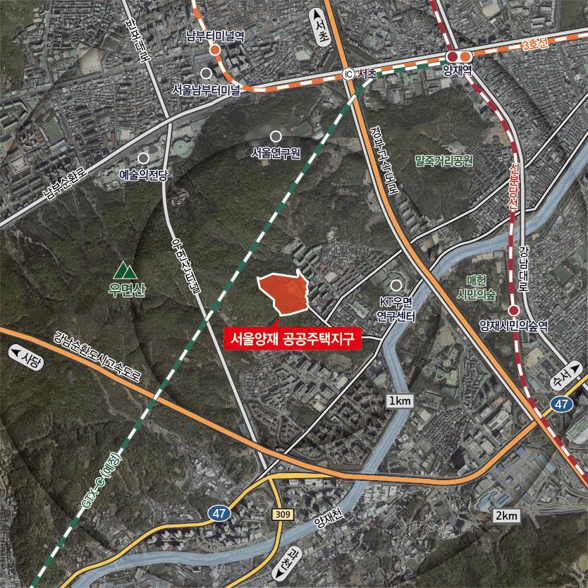 LH는 서울도심 내 발이 빠른 주택공급을 위해 인허가기간 단축 등의 노력을 통해 2028년 상반기에는 주택을 공급하겠다는 계획이다. 서울양재 공공주택지구는 서울 강남구 서초구에 위치하며 우수한 교통·생활 입지여건을 갖췄다.