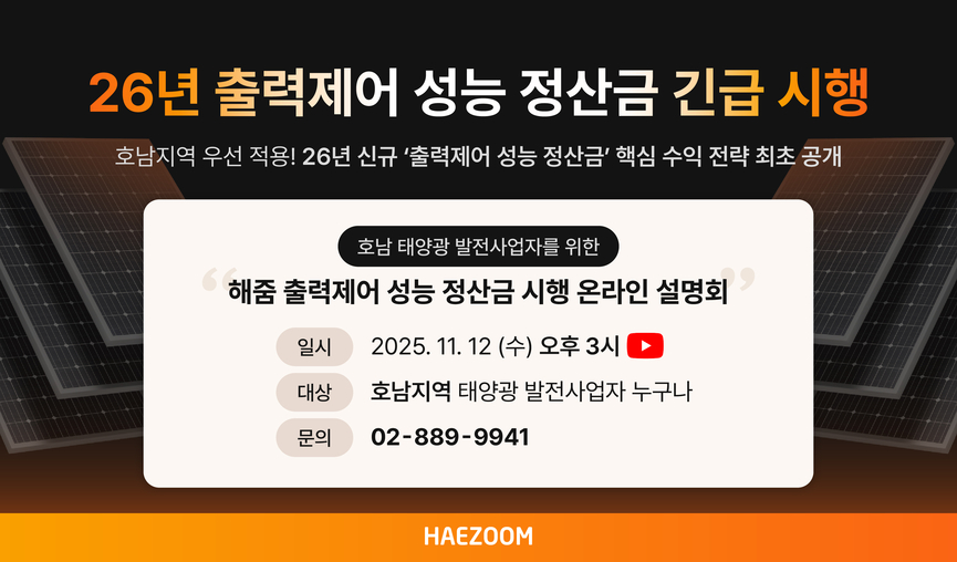 대한민국 1호 VPP기업 해줌(대표 권오현)은 오는 11월12일 호남지역 태양광발전사업자를 대상으로 '출력제어 성능 정산금 시행' 무료 온라인세미나를 개최한다고 밝혔다.