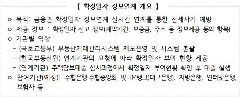 이러한 문제점을 해소하기 위해 은행권의 주택담보대출 심사과정에서 담보대상 주택에 부여된 확정일자 유무 및 보증금 규모를 실시간 확인하고 대출이 실행되도록 절차를 개선하기 위함이다.