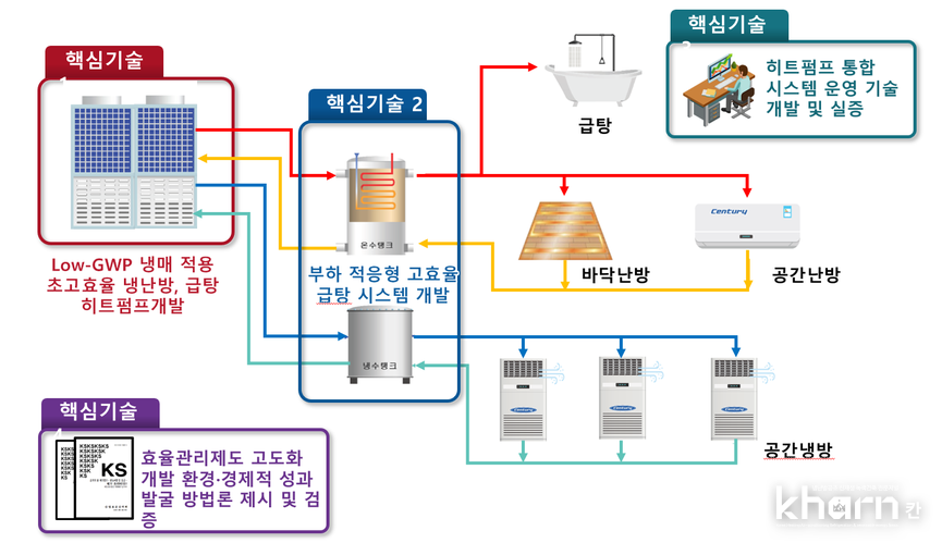 공기열원 히트펌프가 확대되기 위해서는 한랭지운전에서의 신뢰성이 확보돼야 하기 때문에 한랭지 조건에서 정격난방능력 100% 확보, 고온출수(70℃ 이상)를 위한 시스템설계 최적화, 안전성 확보를 위한 시스템설계 및 제어기술 확보 등을 주요 목표로 담았다. 또한 한국에너지공단과의 협업을 통한 고효율 기자재 인증 기준(안) 도출도 과제에 포함된다.