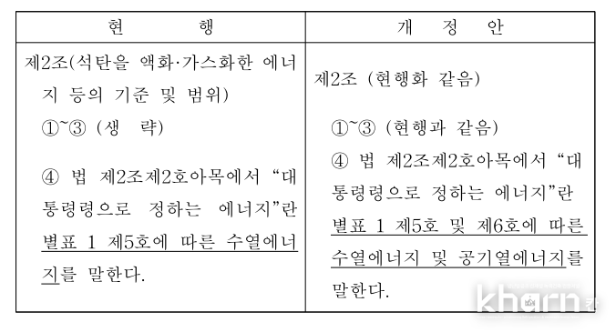 개정안에 따르면 신에너지 및 재생에너지 개발·이용·보급 촉진법 2조제4항 및 별표1을 개정해재생에너지 범위에 공기열에너지가 신설했다.