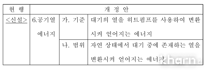 또한 별표1에서는 공기열원 에너지 기준과 범위를 '가. 대기열을 히트펌프를 사용해 변환시켜 얻어지는 에너지’, ‘나. 범위는 자연상태에서 대기중에 존재하는 열을 변환시켜 얻어지는 에너지’로 한다는 내용을 담았다.