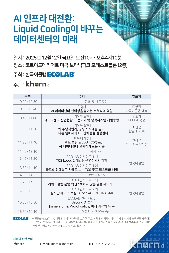 한국이콜랩은 12월12일 서울 강서구 코트야드메리어트 마곡 보타닉파크에서 ‘AI 인프라 대전환: 리퀴드쿨링이 바꾸는 데이터센터의 미래’를 주제로 기술세미나를 개최한다고 밝혔다.