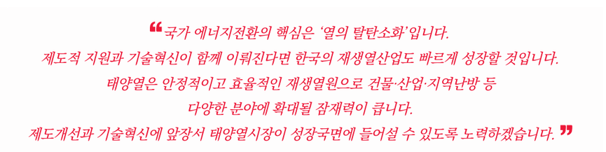 태양열과 PVT분야 제도개선을 위해 적극 힘쓰며 국내 재생열에너지산업의 발전을 선도해 탄소중립 사회로 나아가는 든든한 기반을 마련하고 신재생에너지산업의 선도적 역할을 지속적으로 수행하겠다.