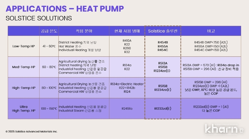 Honeywell에서 냉매사업부문이 분할돼 설립된 Solstice Advanced Materials는 기존 HFC대비 Low GWP, 높은 안전성, 시스템 호환성을 갖춘 친환경 솔루션인 △Solstice® N15(R515B) △Solstice® 1234ze(E) △Solstice® 1233zd(E) 등 ‘HFO냉매’로 고효율 히트펌프 적용에 최적화된 선택지를 제공한다.