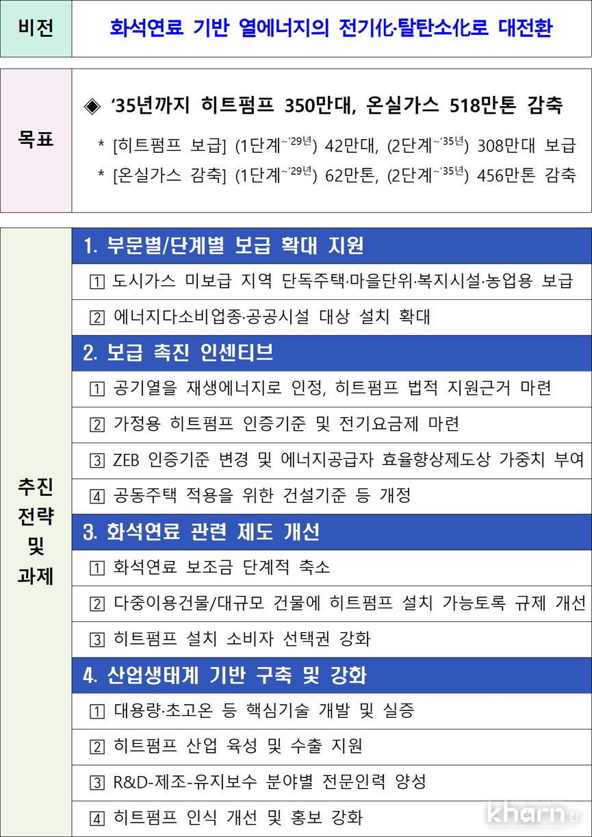 열에너지정책 최우선 실행과제로 기존 화석연료 중심 난방시스템에서 벗어나 히트펌프를 중점보급하기 위해 ‘히트펌프 보급 활성 화 방안’을 마련했다.