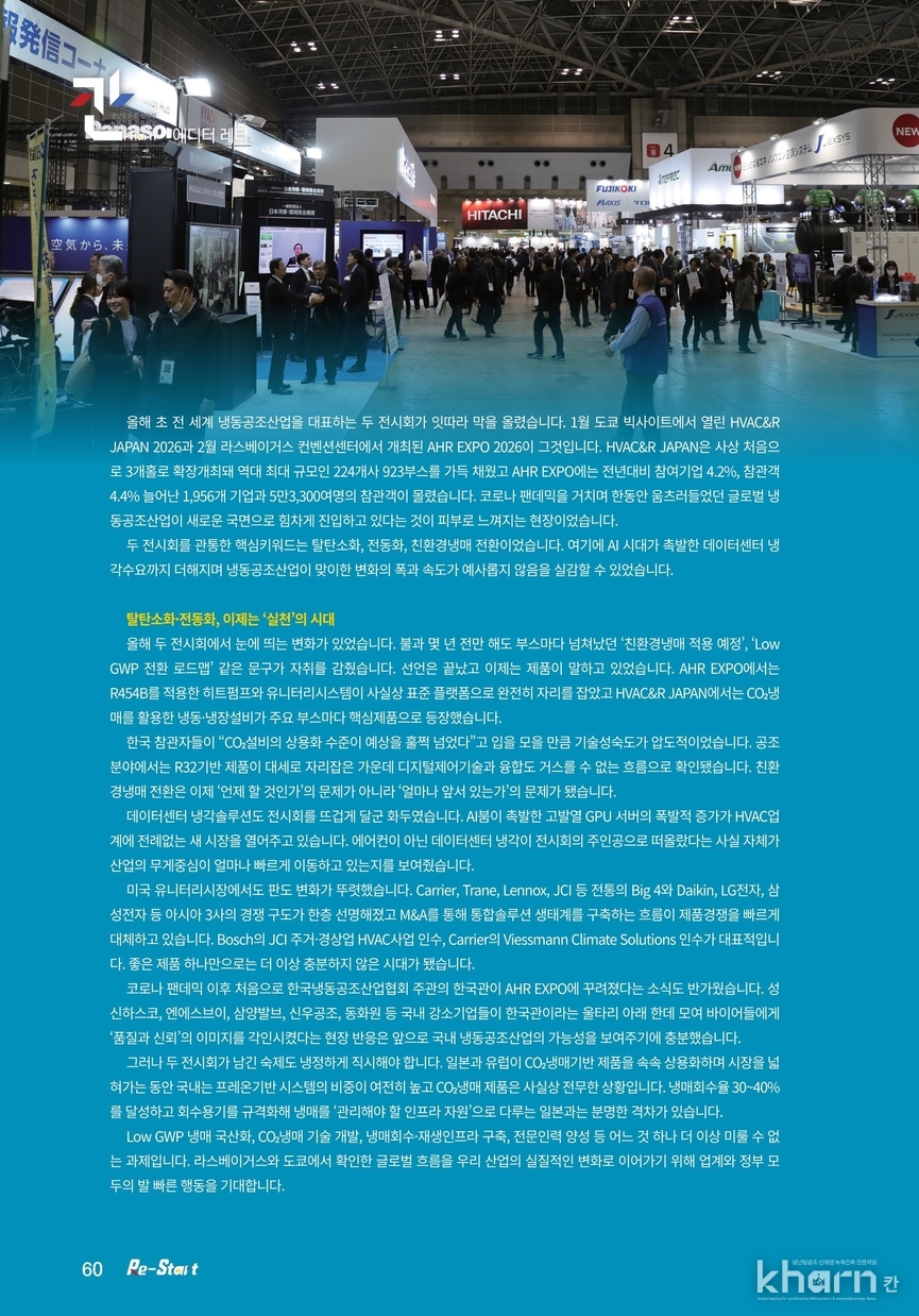 올해 초 전 세계 냉동공조산업을 대표하는 두 전시회가 잇따라 막을 올렸습니다. 1월 도쿄 빅사이트에서 열린 HVAC&R JAPAN 2026과 2월 라스베이거스 컨벤션센터에서 개최된 AHR EXPO 2026이 그것입니다. HVAC&R JAPAN은 사상 처음으로 3개홀로 확장개최돼 역대 최대 규모인 224개사923부스를 가득 채웠고 AHR EXPO에는 전년대비 참여기업 4.2%, 참관객 4.4% 늘어난 1,956개 기업과 5만3,300여명의 참관객이 몰렸습니다. 코로나 팬데믹을 거치며 한동안 움츠러들었던 글로벌 냉동공조산업이 새로운 국면으로 힘차게 진입하고 있다는 것이 피부로 느껴지는 현장이었습니다.