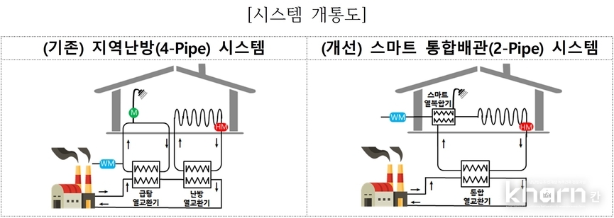 스마트 통합배관시스템은 기존 지역난방의 4관식(난방 공급·환수, 급탕 공급·환수) 배관 체계를 2관식(가열수 공급·환수) 구조로 단순화한 고효율 난방시스템이다.