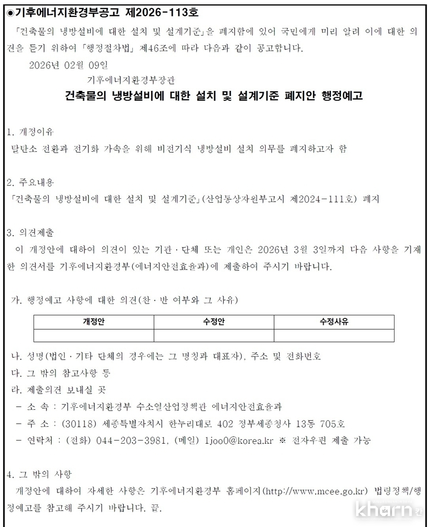 기후에너지환경부는 최근 탈탄소 전환과 전기화 가속을 위해 비전기식 냉방설비 설치 의무를 폐지하는 ‘건축물의 냉방설비에 대한 설치 및 설계기준’ 폐지안을 행정예고했다.