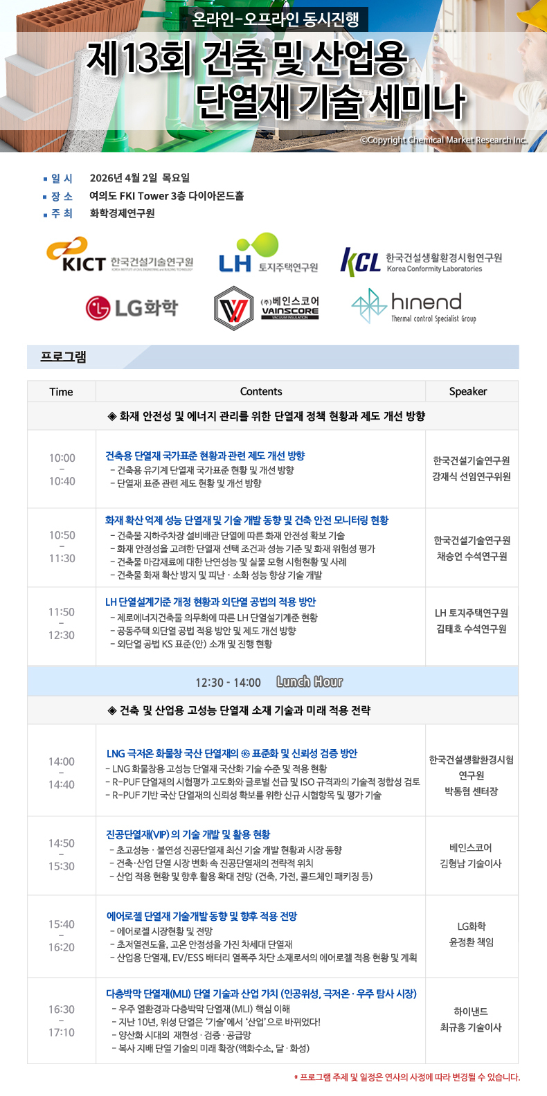 주요 연사로는 △건설기술연구원 △LH 토지주택연구원 △건설생활환경시험연구원 △LG화학 △HINEND △베인스코어 등 단열소재 연구기관 및 업계 전문가들이 강연에 나선다.