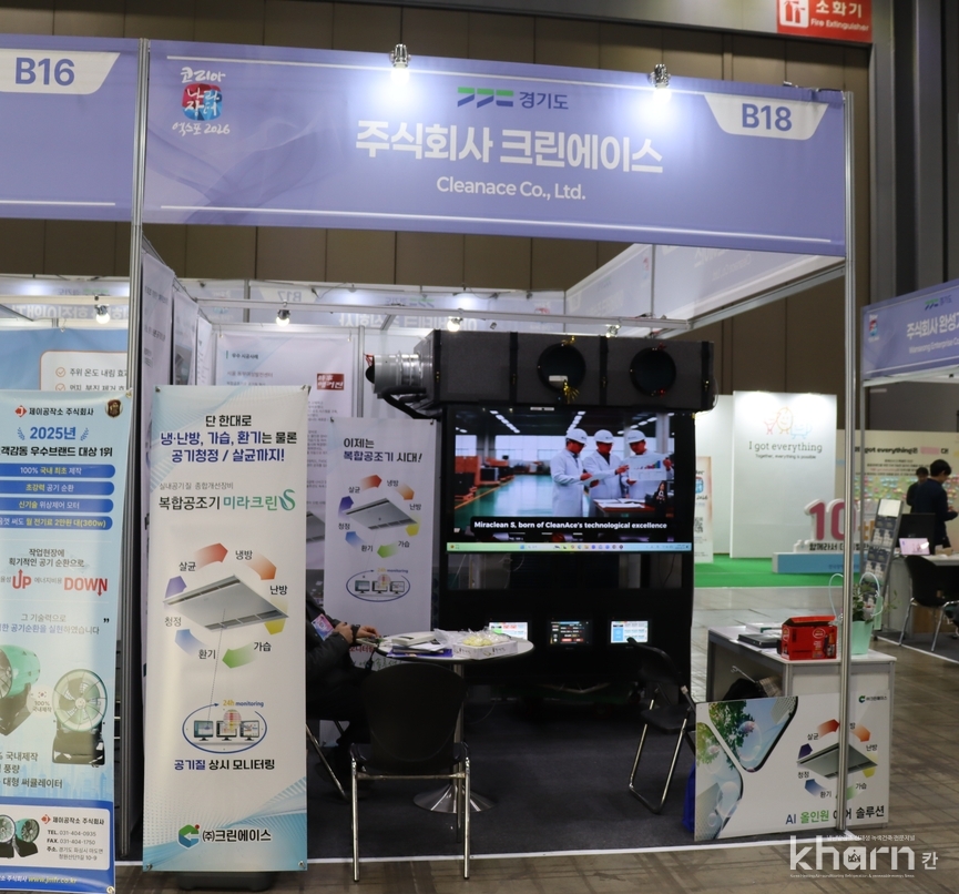 크린에이스는 바닥 면적을 차지하지 않으면서도 강력한 정화성능을 발휘하는 ‘천장 매립형 대용량 공기청정기’를 선보이며 실내공기질관리의 새로운 해법을 제시했다.
