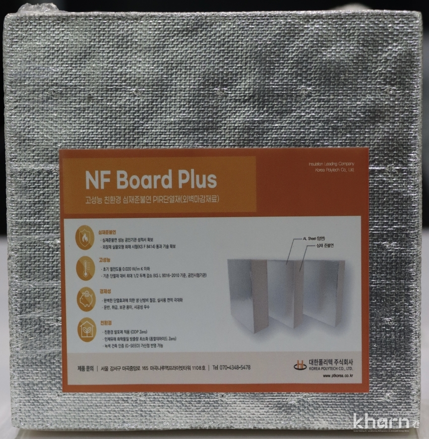 대한폴리텍의 ‘NF Board Plus’는 건축물의 외부용 심재준불연 단열재로 지난 2024년 조달청으로부터 우수제품지정을 받으며 성능을 공인받았다. NF Board Plus는 심재준불연성능 공인기관 성적서를 확보했으며 외장재 실물모형 화재시험(KS F 8414)을 통과했다.