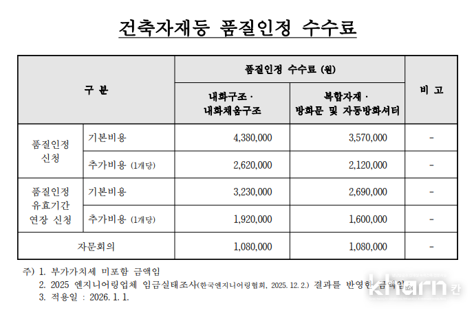 올해 건축자재 등 품질인정 수수료 공고기준을 보면 △내화채움구조 품질인정 신청 기본비용 438만원, 추가비용(개당) 262만원 △품질인정 유효기간 연장신청 기본비용 323만원, 추가비용(개당) 192만원 △자문회의 108만원 등이다. 비용에는 부가가치세가 미포함됐으며 수수료는 엔지니어링업체 임금실태조사 결과에 따라 책정돼 매년 증가하고 있는 추세다.