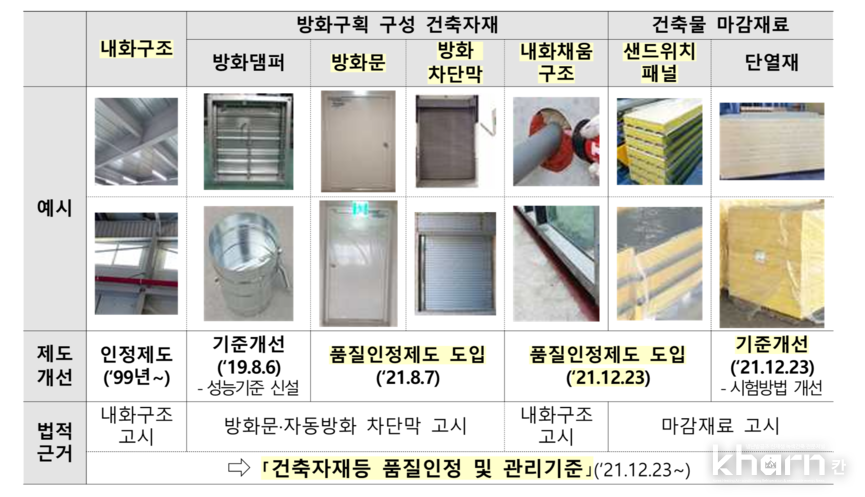 방화문·방화차단막은 2021년 8월7일 부터 품질인정제도가 시행됐으며 기존에 운영되던 △내화구조 인정 및 관리기준 △ 건축물 마감재료 난연성능 및 화재 확산 방지구조 기준 △방화문 및 자동방화셔터의 인정 및 관리기준 등이 ‘건축자재 등 품질인정 및 관리기준’으로 통합돼 2021년 12월23일 시행됐다. 이에 따라 △내화채 움구조 △샌드위치패널 △단열재 등 건축 자재가 품질인정제도에 도입됐다.
