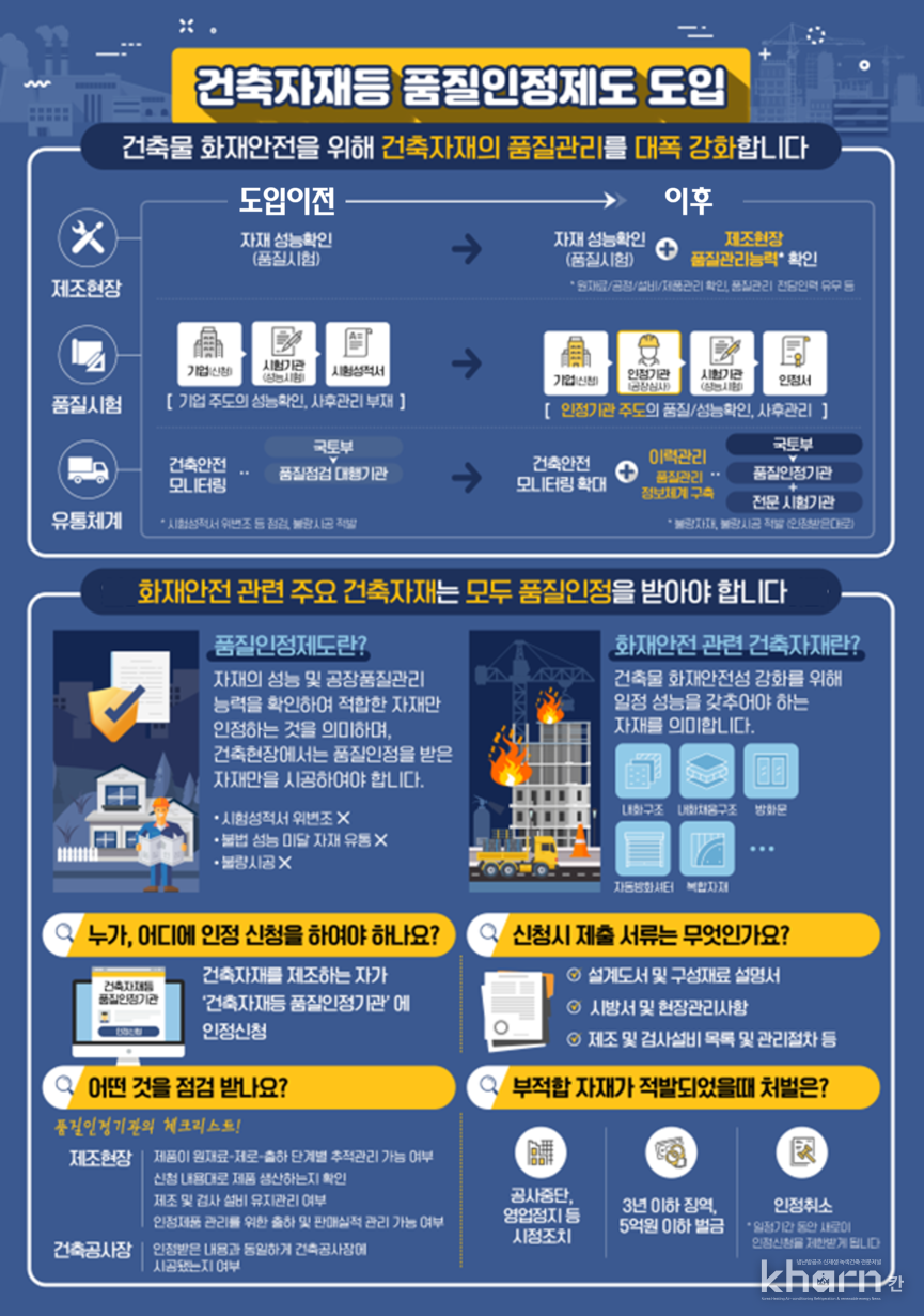 이에 따라 정부는 같은 해 6월 건설현장 대형화재 재발방지를 위해 건설현장 화재안전대책을 발표했으며 12월 건축법 개정을 통해 ‘건축자재 등의 품질인정기간의 지정·운영 등(제52조의 6)’을 신설하며 주요 건축자재에 대한 품질인정제도 확대도입을 추진했다.
