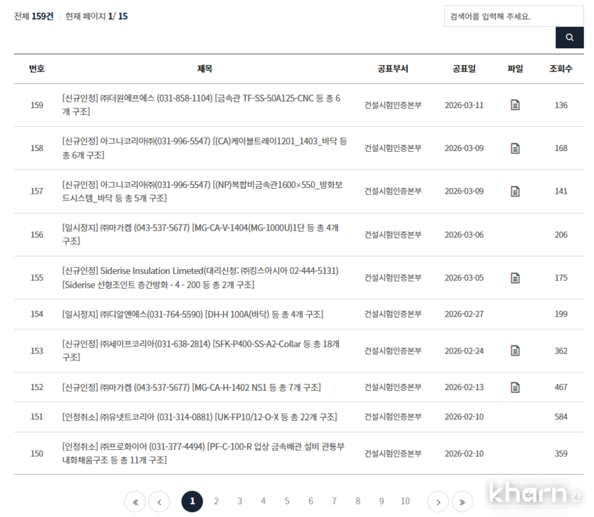 건설연 홈페이지에 공개되는 내화채움구조 인정공고에는 △인정변경 △신규 인정 △일시정지 △인정취소 등 인정현황 이 게시돼 품목에 대한 제재여부를 확인할 수 있다. 단순오기는 수정을 통해 인정 변경이 가능하도록 하고 있으나 한 번 인정을 받으면 인정받은 부분에 대해 수정이 불가하다.