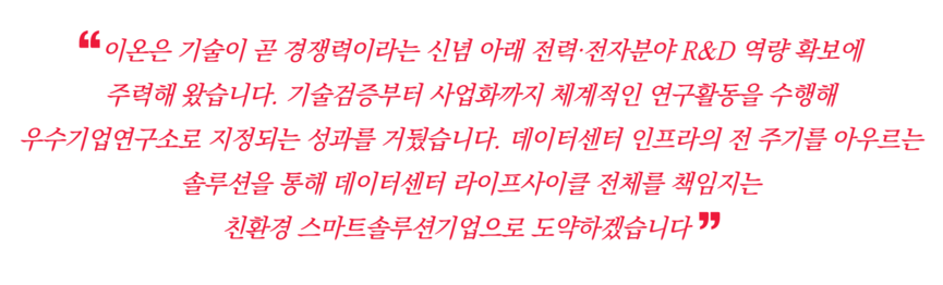 이온은 2002년 설립돼 데이터센터(DC)를 비롯한 다양한 산업군에 △전력 △배터리 △냉각시스템 △구축 △컨설팅 등 토탈솔루션과 서비스를 제공하는 기업이다. 단순 유통이 아닌 기술집약적 기업을 목표로 끊임없이 노력하고 있다.