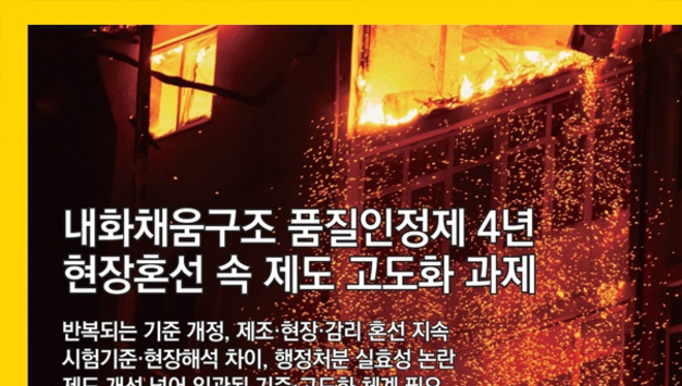 건축물 화재안전과 건축자재 품질 신뢰 확보를 위해 도입된 내화채움구조 품 질인정제도가 시행 4년을 넘겼지만 관련 기준 개정이 이뤄지는 상황에서도 △제조 △현장 △감리 등 전반에서 혼선이 이어지고 있다. 내화채움구조는 방화구획을 관통하는 설비 틈새를 통해 확산될 수 있는 △연기 △화염 △유독가스 등을 차단해 재실자의 피난시간을 확보하는 건축자재다. 내화채 움구조와 같은 화재 안전성능이 요구되는 자재는 품질인정제도를 통해 성능과 품질 을 검증받는다. 제도를 통해 내화채움구조의 품질관리가 강화됐음에도 △시험비용·기간 부담 △ 법령 이원화 △행정처분 실효성 등 구조 적 한계가 여전히 드러나며 제도운영 전 반에 대한 개선과 관리 강화 필요성이 제기되고 있다. 이번 기획에서는 내화채움구조 품질인 정제도 도입 배경과 현장에서 반복적으로 제기되는 주요 쟁점을 짚고 제도의 안정적 정착을 위한 개선 방향을 살펴본다. 내화채움구조 품질인정제 도입배경 품질인정제도는 화재안전성능이 요구 되는 건축자재 등이 적합하게 생산되는지 전문기관을 통해 사전에 인정받은 후 인 정받은 대로 현장에 유통·시공될 수 있도록 성능과 품질을 관리하는 제도다. 품질인정제도는 1999년 내화구조를 대상으로