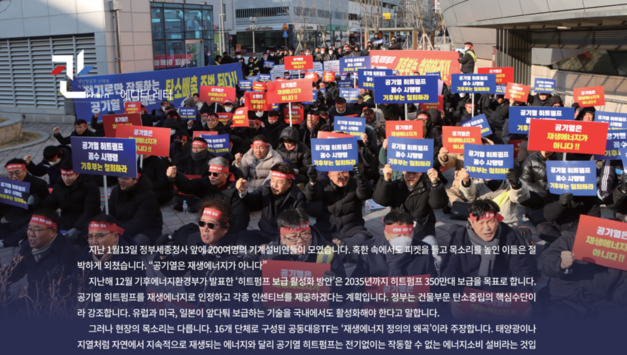 지난 1월13일 정부세종청사 앞에 200여명의 기계설비인들이 모였습니다. 혹한 속에서도 피켓을 들고 목소리를 높인 이들은 절박하게 외쳤습니다. “공기열은 재생에너지가 아니다” 지난해 12월 기후에너지환경부가 발표한 ‘히트펌프 보급 활성화 방안’은 2035년까지 히트펌프 350만대 보급을 목표로 합니다. 공기열 히트펌프를 재생에너지로 인정하고 각종 인센티브를 제공하겠다는 계획입니다. 정부는 건물부문 탄소중립의 핵심수단이라 강조합니다. 유럽과 미국, 일본이 앞다퉈 보급하는 기술을 국내에서도 활성화해야 한다고 말합니다. 그러나 현장의 목소리는 다릅니다. 16개 단체로 구성된 공동대응TF는 ‘재생에너지 정의의 왜곡’이라 주장합니다. 태양광이나 지열처럼 자연에서 지속적으로 재생되는 에너지와 달리 공기열 히트펌프는 전기없이는 작동할 수 없는 에너지소비 설비라는 것입니다. 법적으로도 수열은 신재생에너지법에 명시돼 있지만 공기열은 그렇지 않습니다. 시행령만으로 재생에너지에 포함시키는 것은 적법한가라는 질문도 제기됩니다. 기술적 우려도 만만치 않습니다. 공기열 히트펌프는 외기온도가 -5℃ 이하로 떨어지면 성능이 급격히 저하돼 오히려 가스보일러보다 탄소배출량이 많아질 수 있다