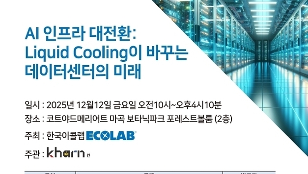 한국이콜랩은 12월12일 서울 강서구 코트야드메리어트 마곡 보타닉파크에서 ‘AI 인프라 대전환: 리퀴드쿨링이 바꾸는 데이터센터의 미래’를 주제로 기술세미나를 개최한다고 밝혔다. 이콜랩이 주최하고 칸kharn이 주관하는 이번 행사는 AI 데이터센터(DC) 운영·설비·엔지니어링 담당자와 투자기업 관계자가 참석해 △차세대 냉각기술 △수처리 관리 △실시간 운영기술 등을 공유하기위해 마련됐다. 한국이콜랩은 AI DC의 냉각수 운용부담을 줄이고 시스템 신뢰성향상을 위해 3D TRASAR™와 Water Quality IQ™솔루션을 활용해 실시간 수질분석체계를 구축하고 있다. 이번 세미나에서 냉각효율 극대화와 시스템 운영비용 절감의 실제 효과를 소개하며 AI DC 냉각인프라 최적화를 위한 기술적 인사이트를 공유할 계획이다. 발표에는 류양권 한국이콜랩 대표와 데이터센터 사업부 임직원 외에 송준화 한국데이터센터에너지효율협회(KDCEA) 사무국장, 조진균 국립한밭대학교 건축설비시스템공학과 교수, 연창근 하이멕 총괄사장이 참여한다. 발표자들은 DLC(Direct To Liquid Cooling) 및 냉각수처리 관련 경험을 토대로 향후 AI DC 설계방향과 냉각인프라 발전방향을 제